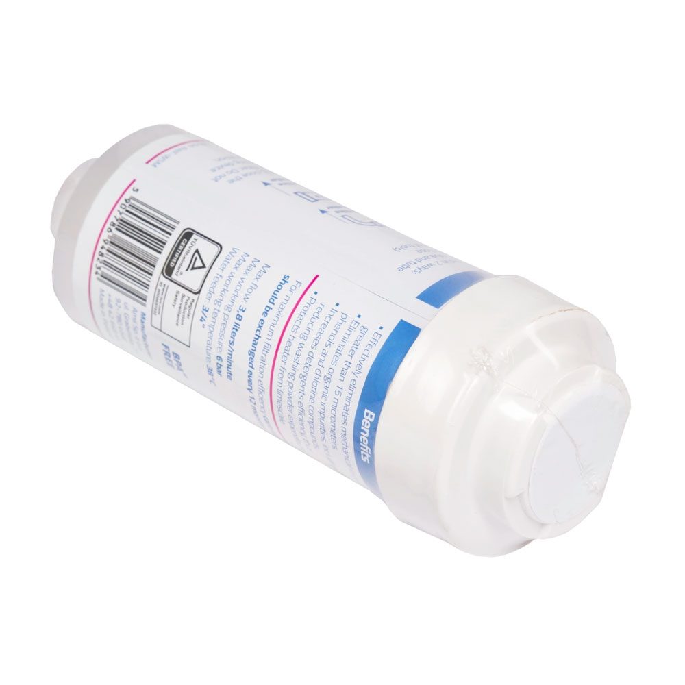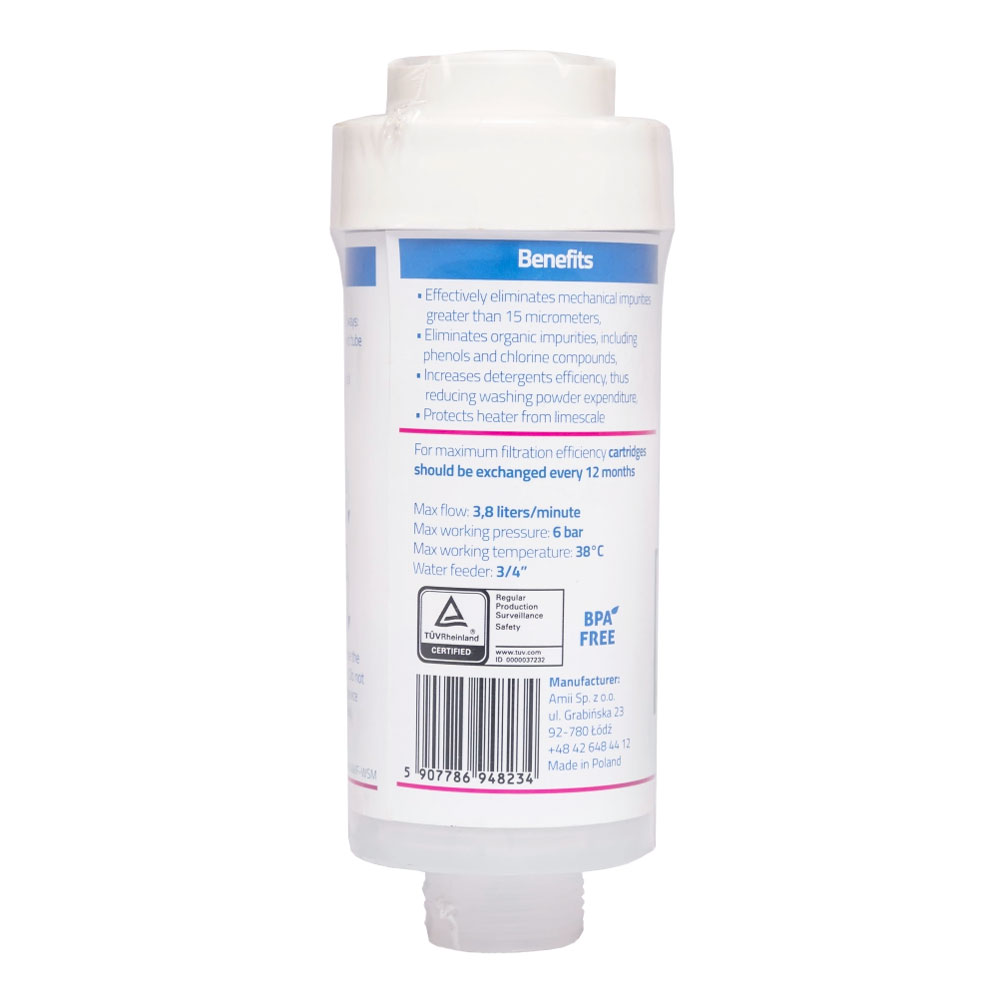 Фильтр изготовлен из прочной высококачественной пластмассы и рассчитан на длительное использование. Он устанавливается на подачу воды к технике и подходит как для стиральных, так и для посудомоечных машин. Стандартное подключение 3/4'' обеспечивает совместимость с большинством бытовых моделей.