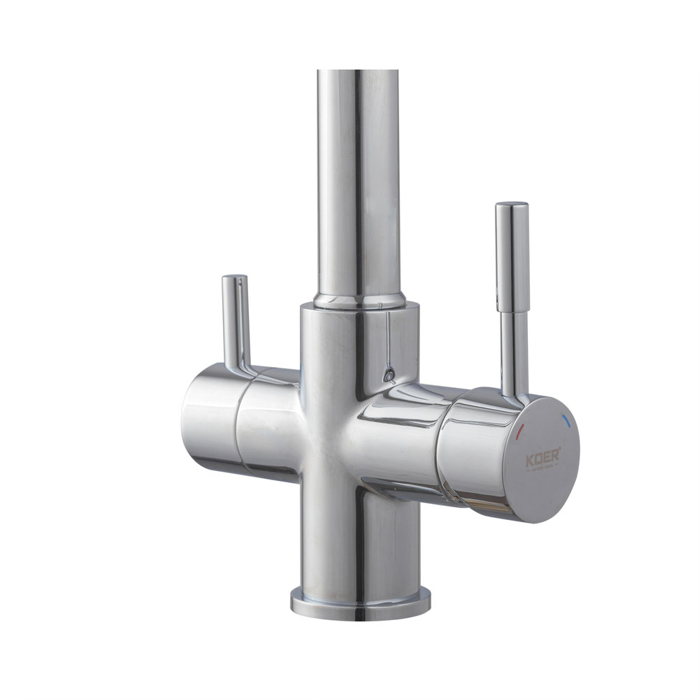 Кран-смеситель KOER KB-72025-01 разработан для кухонь с подключённой системой фильтрации и ориентирован на стабильную работу в условиях ежедневной нагрузки. Модель сочетает в себе функции обычного кухонного смесителя и отдельный выход для очищенной питьевой воды, что позволяет рационально организовать водопользование без установки дополнительного оборудования.