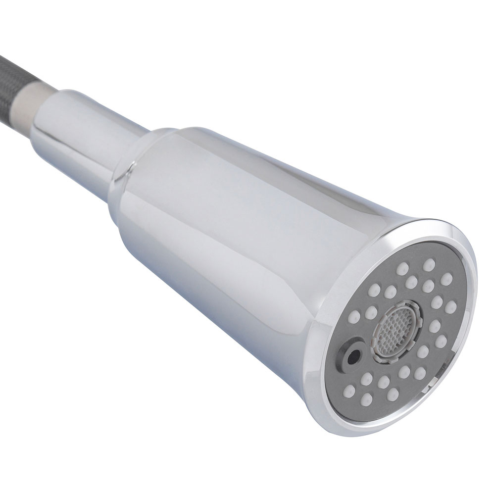 Корпус выполнен из латуни с элементами из силикона, что обеспечивает прочность конструкции и комфорт при использовании. Хромированная поверхность устойчива к повседневным нагрузкам и подходит для большинства кухонных интерьеров в стиле модерн.