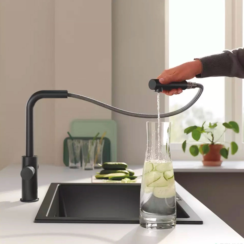 Корпус выполнен из латуни, что обеспечивает устойчивость к нагрузкам, влаге и перепадам температур. Черное покрытие подчёркивает современный дизайн кухни и делает смеситель выразительным элементом интерьера. Поворотная конструкция и выдвижной излив значительно упрощают мытьё посуды, ополаскивание мойки и наполнение ёмкостей разного размера.