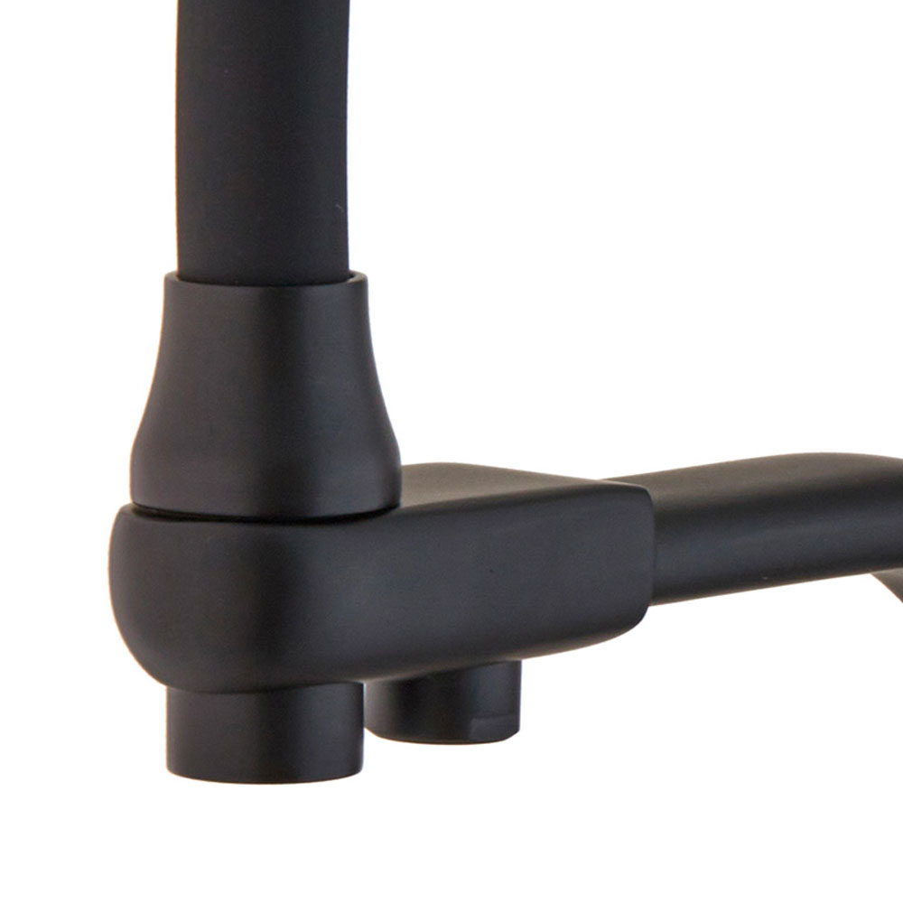 Корпус изготовлен из прочной латуни, устойчивой к коррозии и перепадам давления, а силиконовые элементы излива добавляют гибкости и комфорта при использовании. Матово-чёрное покрытие подчёркивает современный стиль, не бликует при освещении и хорошо маскирует следы воды и отпечатки пальцев. Габариты 415 × 235 мм делают смеситель удобным как для стандартных, так и для более глубоких моек.