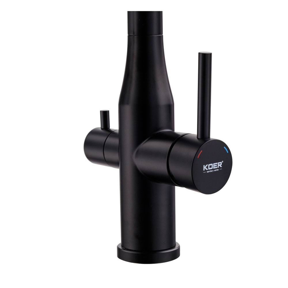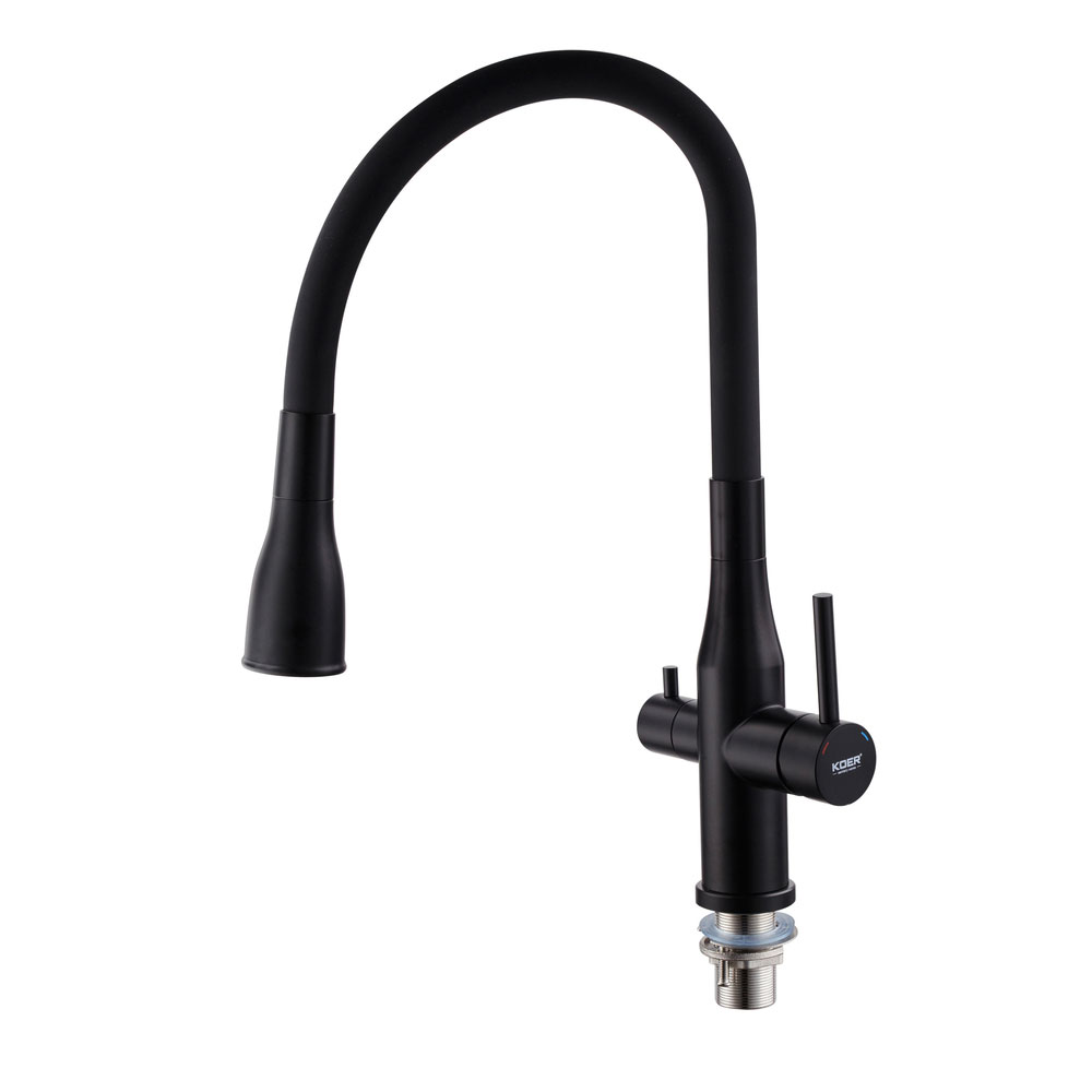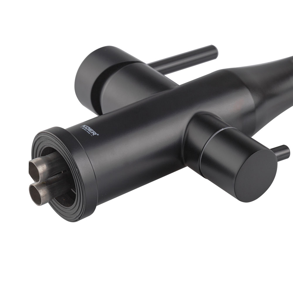 Смеситель KOER KI-72024-05 — это функциональное решение для кухни с системой фильтрации, где важно удобно разделять обычную и очищенную питьевую воду. Модель оснащена отдельным выходом для воды после фильтра, поэтому вы можете использовать её для питья, приготовления напитков и еды, не смешивая с водопроводной.