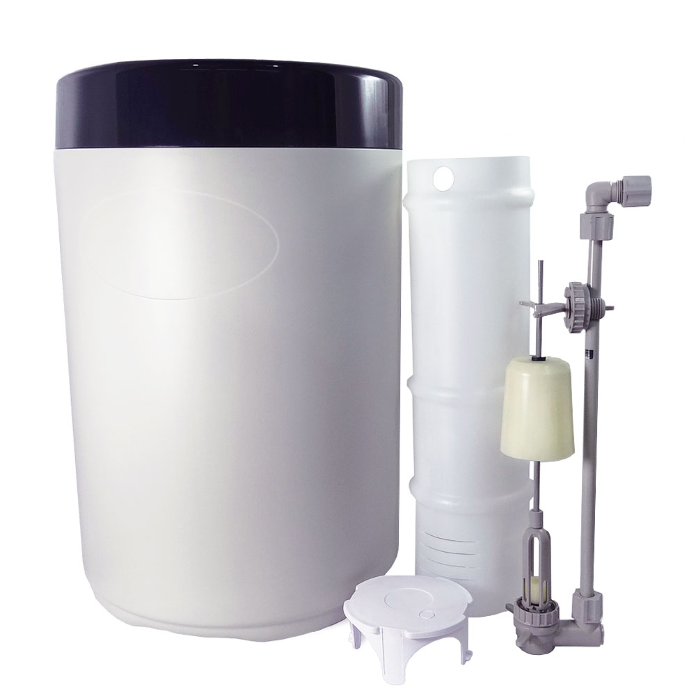 Комплектация бакa включает: пластиковый корпус с крышкой, солевую решётку, рассольную шахту с всасывающей системой, шариковый отсечной клапан и штуцер для соединения с управляющим клапаном умягчителя.