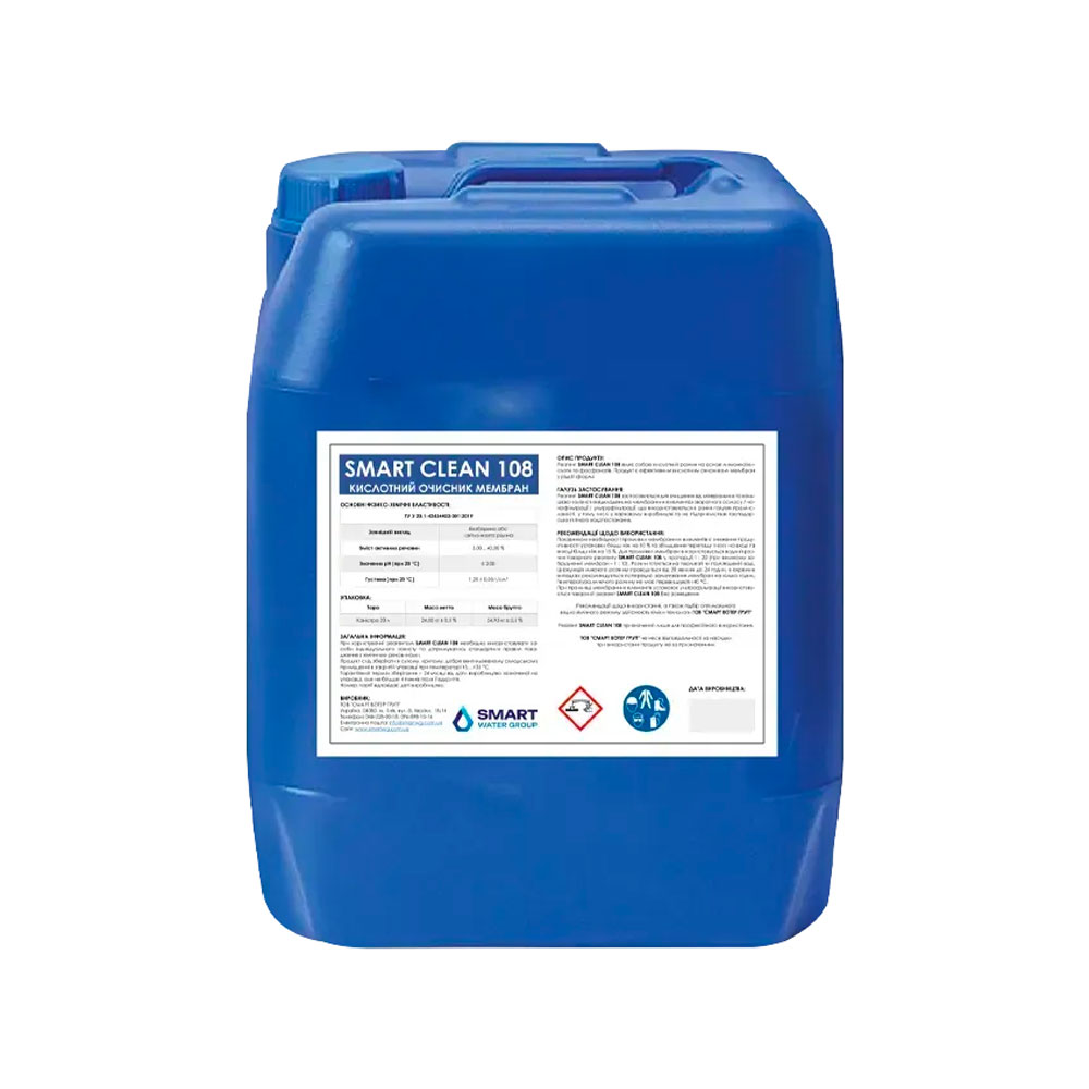Smart Clean 108 — это жидкий кислотный очиститель мембран, предназначенный для удаления минеральных и кальциево-железистых отложений. Продукт применяется для обслуживания мембранных элементов обратного осмоса, нанофильтрации и ультрафильтрации, которые используются в системах промышленной и хозяйственно-питьевой водоподготовки, а также в пищевой промышленности.