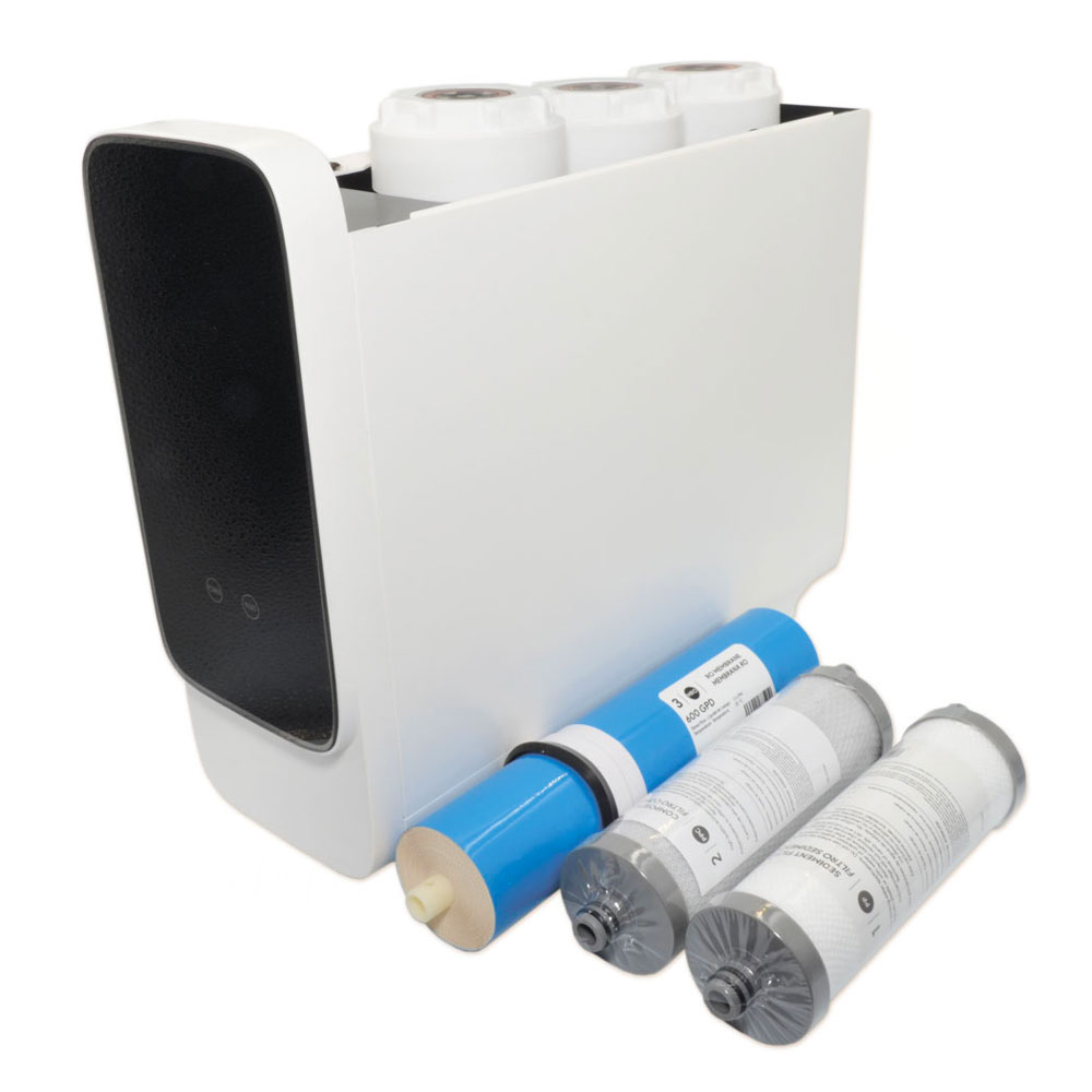 - Мембрана RO membrane 600 GPD — основне очищення: видалення розчинених солей, бактерій і вірусів.